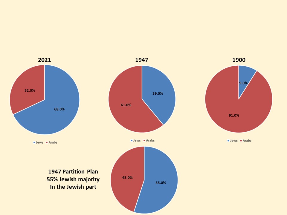 In 2022: a 68% Jewish majority in the combined area of Judea, Samaria and pre-1967 Israel. In 1947 and 1897: a 39% and 9% Jewish minority. In 2022, the 68% Jewish majority benefits from fertility tailwind and net-immigration, while Arab fertility is Westernized, in addition to net-emigration from Judea and Samaria. No Arab demographic time bomb; but, a Jewish demographic momentum. More data in this article and this short video.