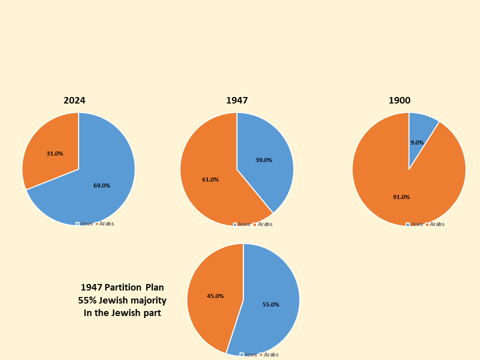In 2024: a 69% Jewish majority in the combined area of Judea, Samaria and pre-1967 Israel, benefitting from a tailwind of fertility and net-immigration, while Arab demography is westernized. In 1947 and 1897: a 39% and 9% Jewish minority.